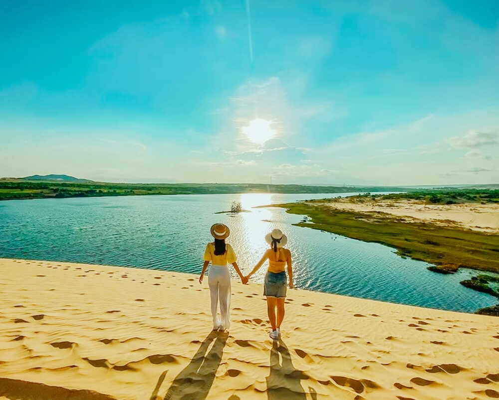 Xe đưa đoàn chinh phục đồi cát bay tại KDL Bàu Sen, điểm đặc biệt khi vào mùa gió chướng, cát di chuyển tạo nên hình thù đẹp mắt và những đụn cát mấp mô. Được đặt cho tên gọi đồi cát bay. Sau lưng đồi cát trắng là Bàu Sen, một ốc đảo mát dịu giữa đồi cát nóng lưu truyền với độ sâu không đáy. Bàu Sen không chỉ là nơi cung cấp nước ngọt, mà còn là thắng cảnh đẹp với nhiều sen nở, sáng rực nơi đây, tô thêm nét đẹp vùng đồi cát trắng.